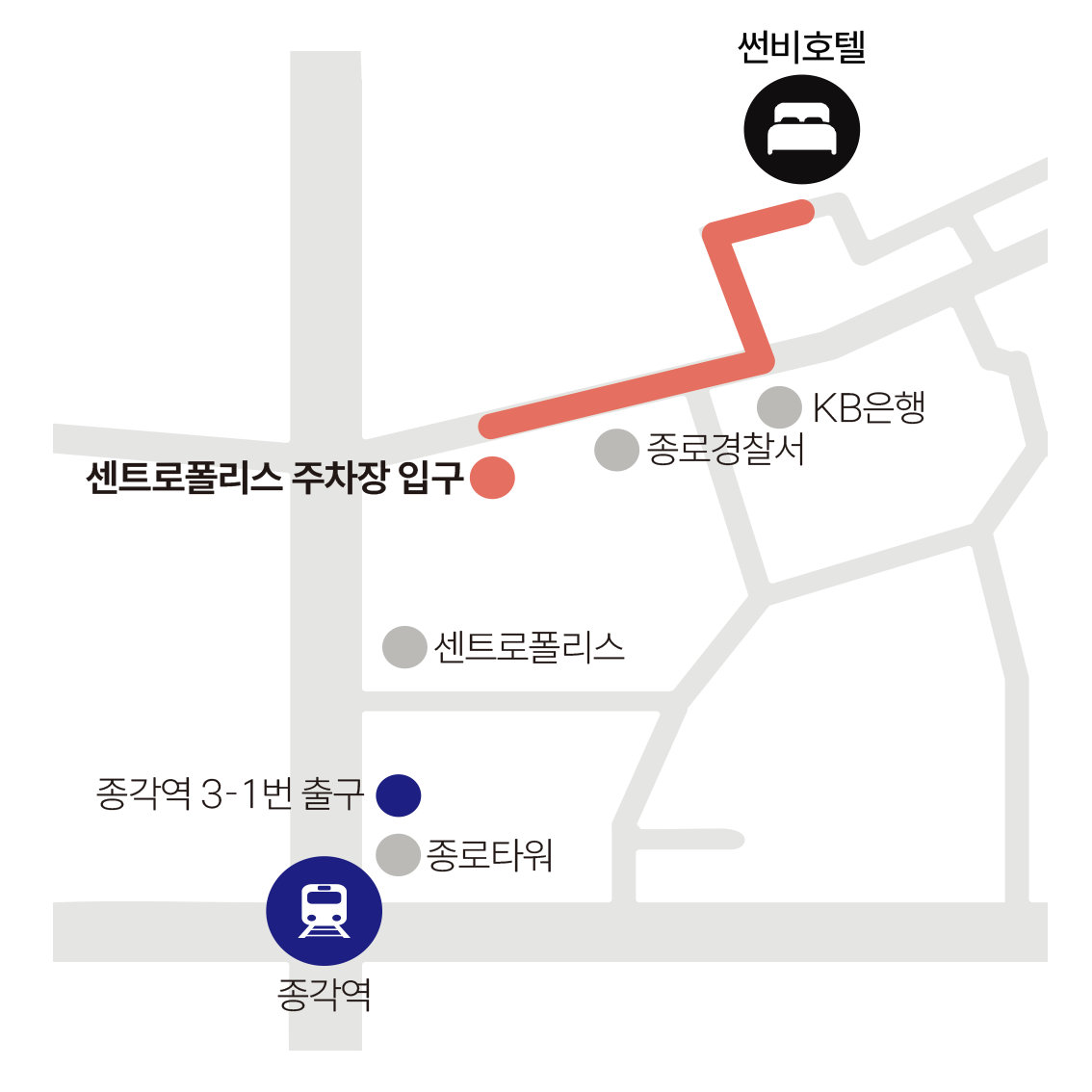 주차 가이드 : 1. 센트로폴리스 주차장에 주차 후 호텔썬비에서 체크인을 진행합니다. 2. 체크인 시 프론트데스크에 주차하신 차량 번호를 알려주시면 주차 무료 쿠폰 등록을 해드립니다. 3. 입차 후 익일 오후 1시까지 자유롭게 입차 및 출차가 가능하며, 오후 1시 이후부터는 초과요금이 발생됩니다.